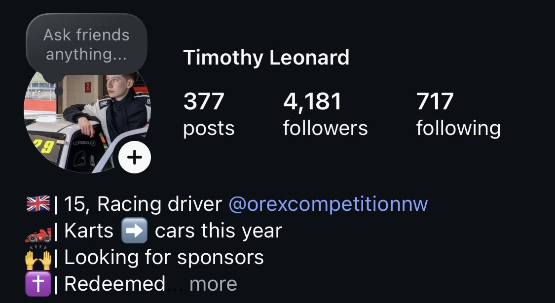 Well, then I’ve got the perfect thing for you. With over 3,000 followers/subscribers and anywhere between 100,000 and 1,000,000 views a week, both my Instagram and Youtube profiles provide the best place to advertise your company. And with the championship I’m going to be driving in next year, held all over the country, with audiences of up to 20,000 people, including the official livestreams, now is the best time to form a long-lasting partnership that will grow with your business.